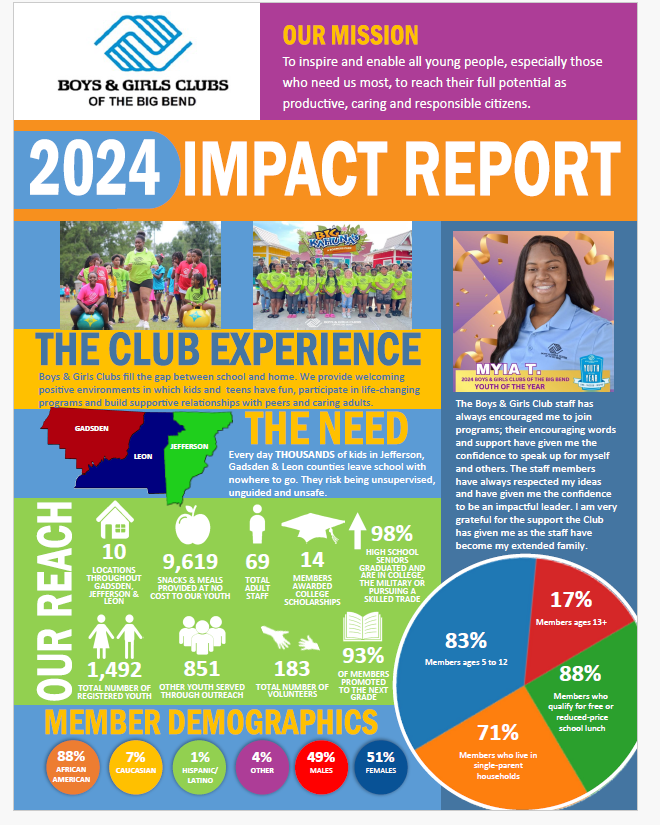 At Boys & Girls Clubs of the Big Bend, we work with children—but we build adults. Our mission goes beyond after-school care; it’s about preparing young people for life. Statistics show that our Club members make smart choices, stay engaged in school, and graduate with the confidence and skills to succeed in college, careers, and beyond.